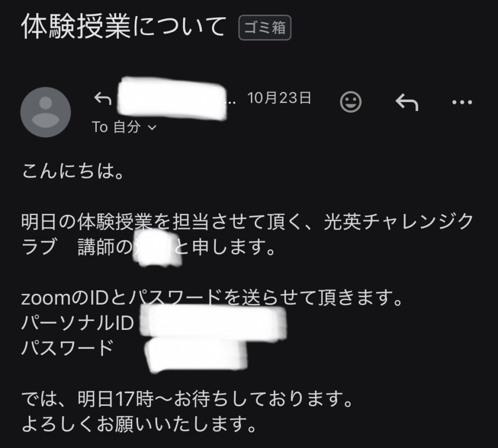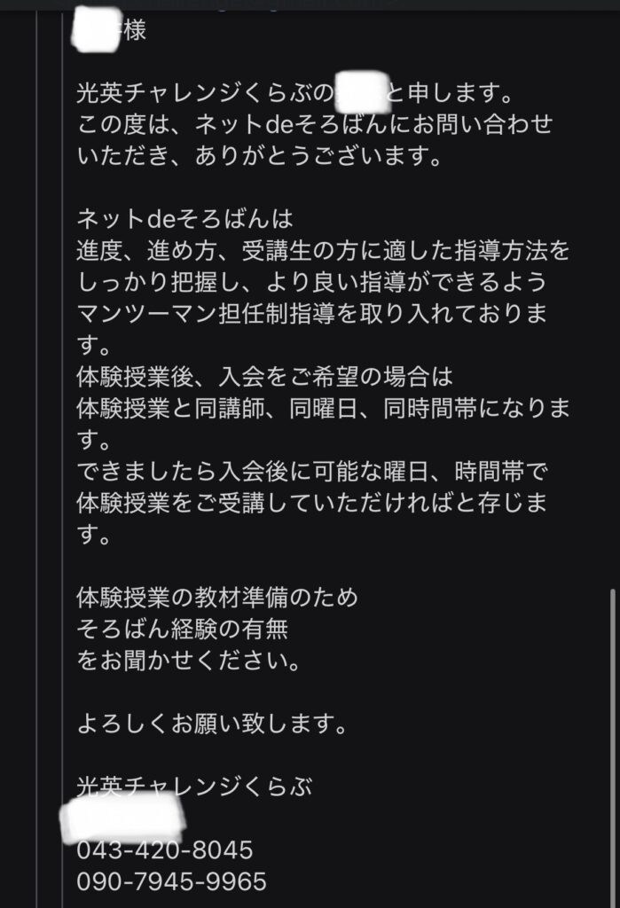 うちの場合は、そもそも私が体験申し込みをしたくせに全然お返事ができていませんでした。